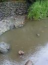 ここから神田川の流れに出ます。最近、降り続いている雨のために、神田川の水かさは随分増水して、流れが速くなっているのが判ります。また、いつもより水の色もにごっているようです。