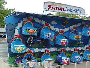 そして、子ども用の遊具では、アンパンマンのハッピースカイというものに子どもを乗せました。初めて見るタイプのアトラクションです。狭い場所にも設置できるので、良いかもしれません。