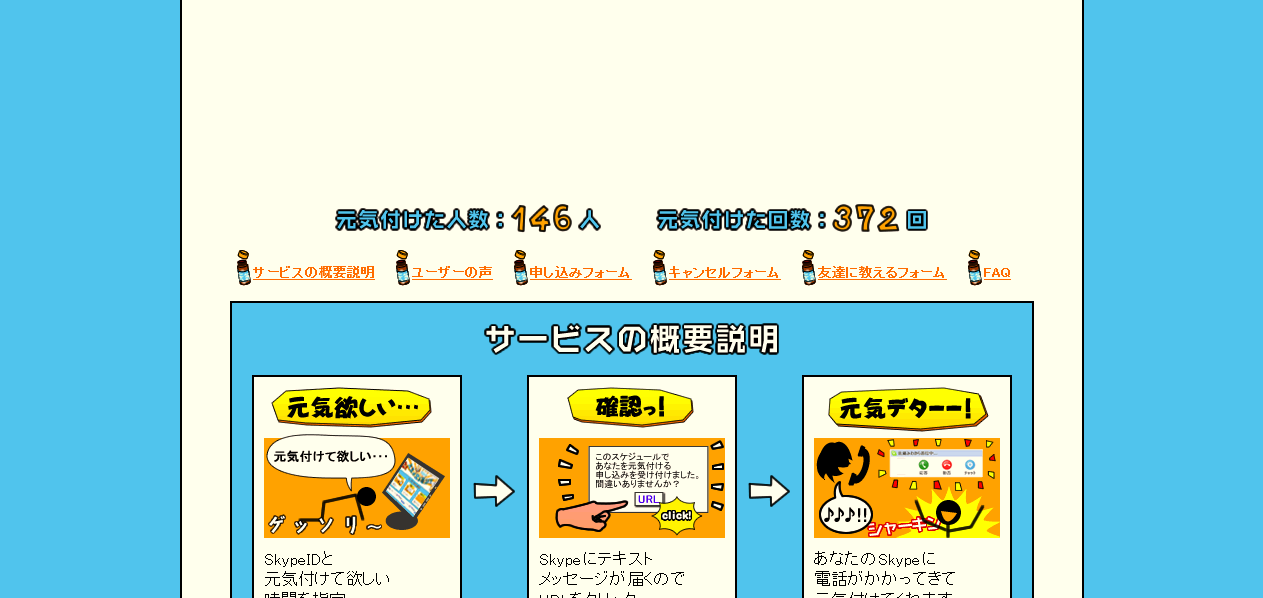 はてなブックマークの人気エントリーを見ていると、「元気が出る電話!!」というサービスがあることを知りました。無料のサービスです。Skype IDを登録すると、無料で電話をかけてきてくれて、励ましてくれるのだそうです。