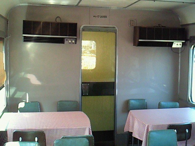 車内は後年に電気機関車の訓練設備が増設されて改造されていますが、車輌の半分には食堂車っぽい雰囲気が残っています。