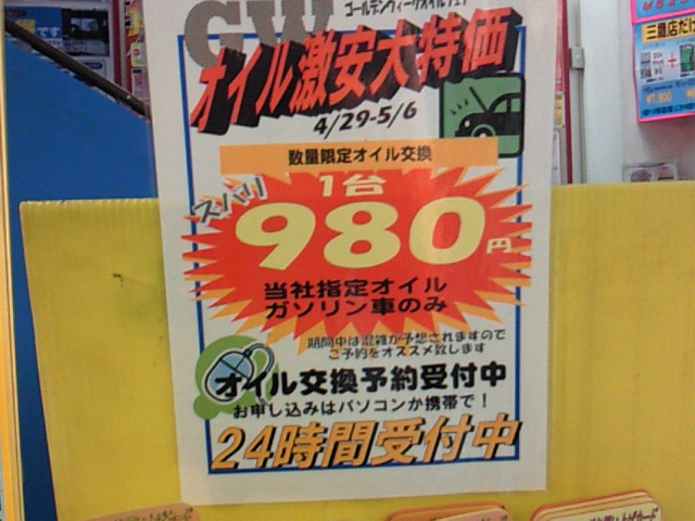 オイルコーナーを見てみると。「オイル交換980円」という文字を見つけてしまいました。