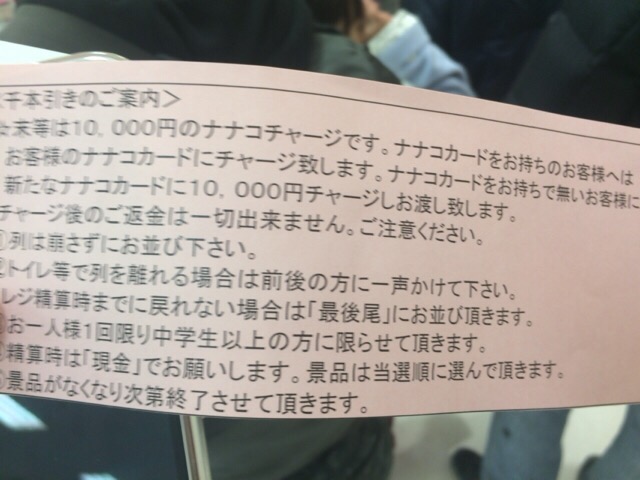 よく、何千円かの買い物をすると福引券をもらうことができて抽選会に参加することができるというイベントはありますが、こちらは一万円のナナコチャージのかわりに福引に参加させるという、ちょっと変わったイベントです。
