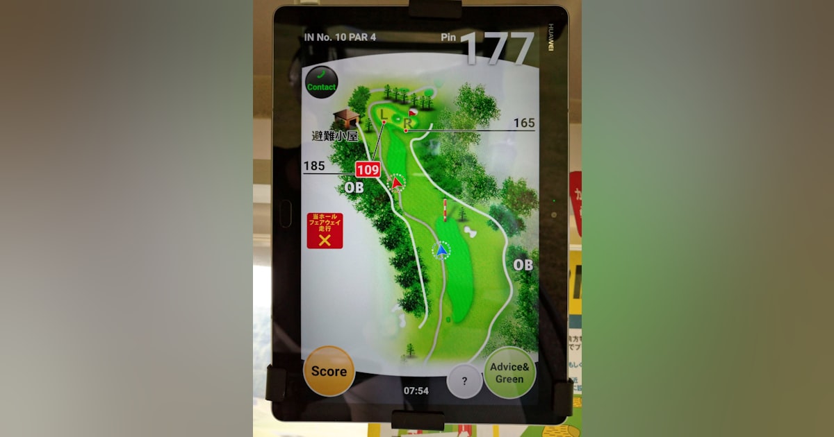 特に最近になってアコーディアが導入しているカートナビに関しては、単に残り距離が判るだけではなく、次に目標としている地点からピンまでの距離、同じ組内でのほかのスコア管理、コンペなどで複数組が出ている場合にはコンペ全員のスコアなどが判ります。ラウンド終了後にはその日のスコアをスマホで取り込んでしまう機能まで付いています。iPadのような端末に見えるのですが、よくよく見るとHuaweiのロゴが入っていました。