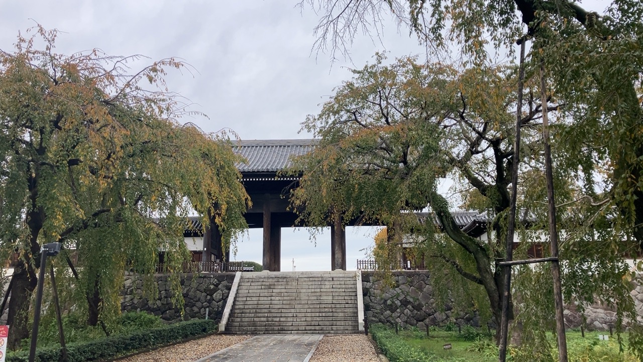 この威厳のある山門は映画「羅生門」のモデルとなりました。左右にある枝垂れ桜は身延山久遠寺から苗を拝領して植えたものです。
