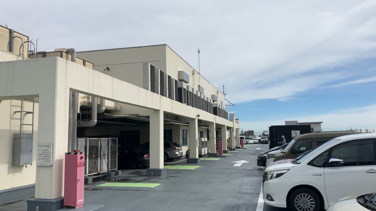 駐車場は市場の建物を取り囲むようにある平面駐車場と建物の屋上にある駐車場の2種類があります。建物の屋上は階段でしか上り下りできません。平面駐車場は満車の様子だったので、今回は屋上駐車場に行ってみました。2階は事務所や倉庫、3階が屋上駐車場です。屋上駐車場はとても広くて空いていました。