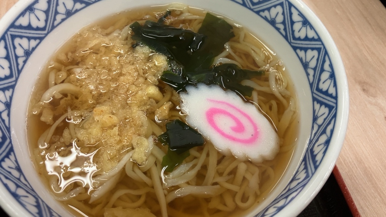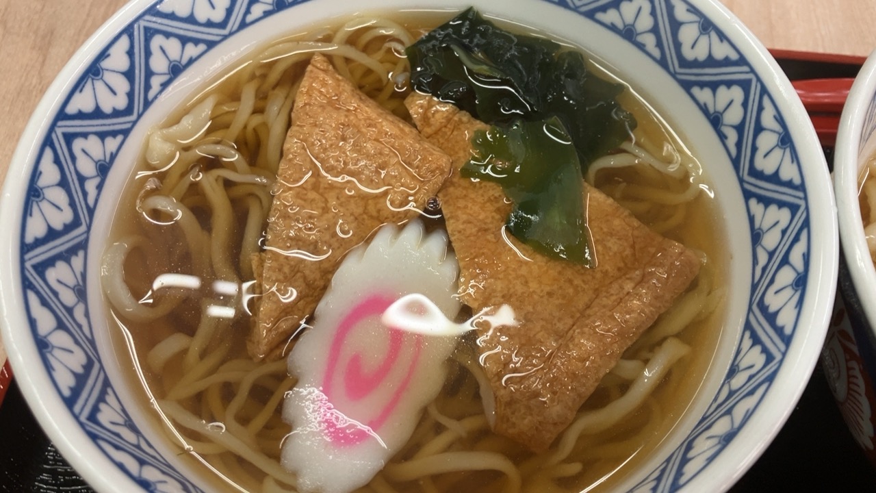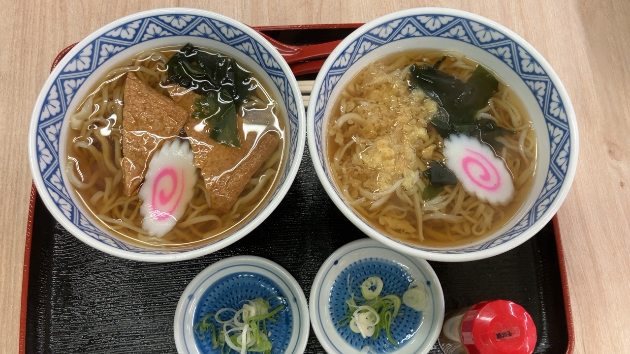 まずは混雑しないうちに腹ごしらえをしておくことにしました。そば敏というお店で、朝蕎麦を500円で販売していました。きつね蕎麦とたぬき蕎麦を買ってみました。お店の向かい側が飲食スペースになっていて、そちらに出来上がったらお店の人が持ってきてくれます。