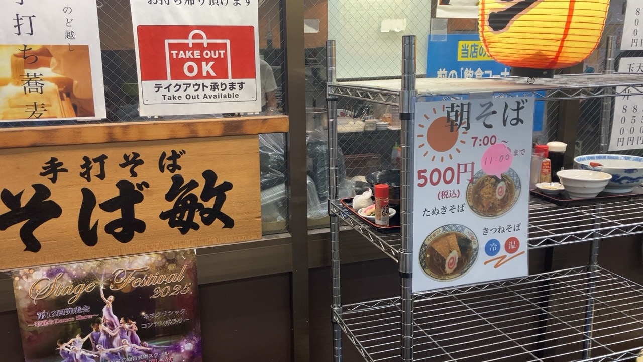 朝蕎麦のきつね蕎麦とたぬき蕎麦を買ってみました。お店の向かい側が飲食スペースになっていて、そちらに出来上がったらお店の人が持ってきてくれます。