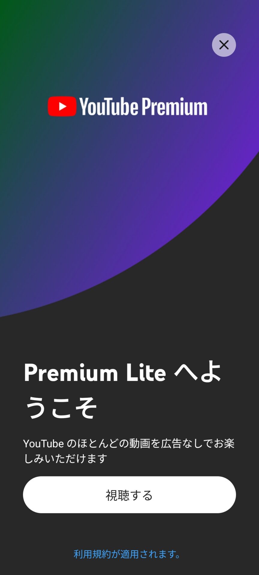 iPhoneでYouTubeアプリを立ち上げてしまったので、画面には月額980円と表示されています。これでは通常よりも高いので、AndroidスマホでYouTube Premium Liteの加入ページをYouTubeアプリで出したところ、月額780円で加入できるページが出てきました。こちらで加入して無事にこちらの画面が出てきました。